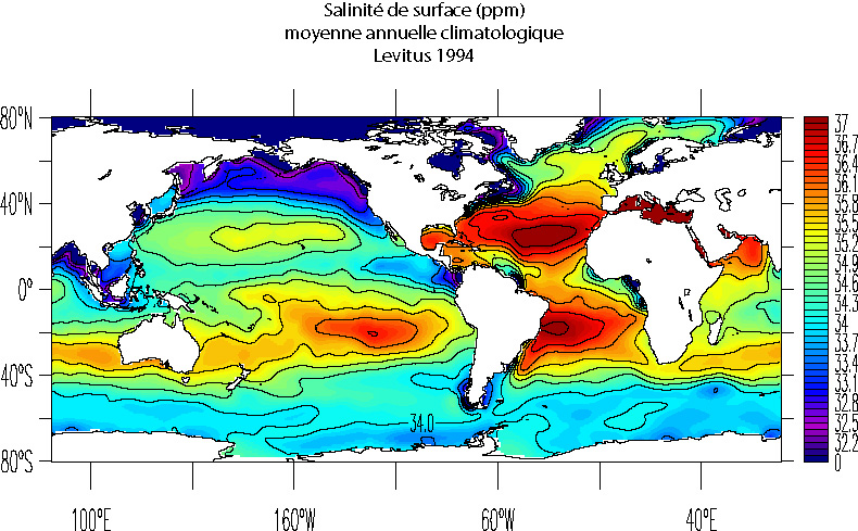 Exercice 2.4.2: Discuter la carte climatologique de distribution annuelle de salinité, figure 2.4.2.